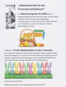 Am Ostermontag den 6.4.2026 lädt der Steigerwaldklub Oberscheinfeld alle Kinder mit ihren Eltern, Freunden, Omas und Opas zum traditionellen Ostereiersuchen an unserer Turmruine in Oberscheinfeld ein. Wir würden uns über Ihren Besuch an diesem Nachmittag sehr freuen.